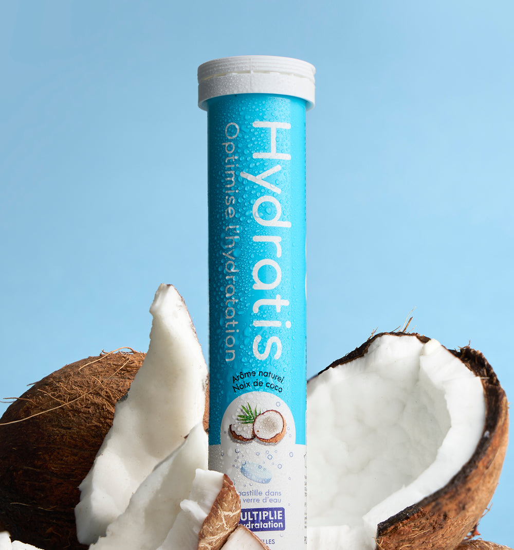 In addition to improving water absorption thanks to its formula based on electrolytes and trace elements, Hydratis lozenges make hydration more enjoyable with natural fruity flavors. Peach, Pineapple, Coconut, Lemongrass Ginger… there's something for every palate! And for those who find water "bland" and don't like its taste, Hydratis helps you drink more regularly.